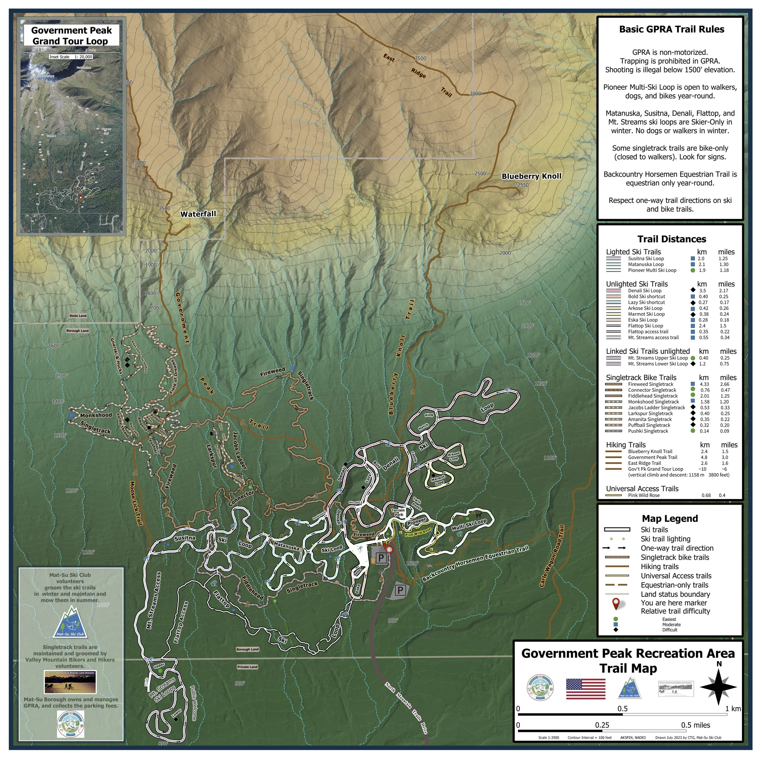 The Mat-Su Ski Club maintains 17 km of groomed Nordic ski trails, with 6.5 km lighted in the evenings. GPRA opens at 8 AM and closes at 10 PM (summer), 9 PM (winter)